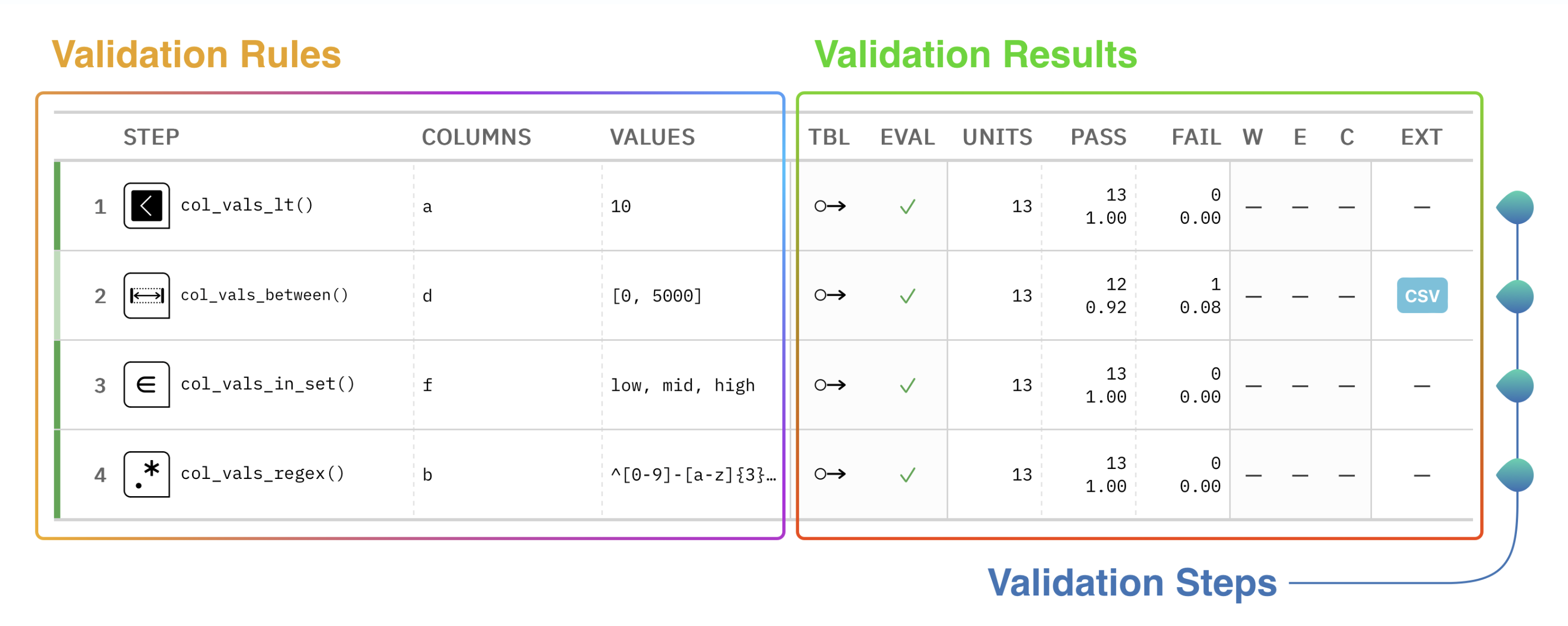 For example, the first row is a step that checks whether values in column ‘a’ are less than 10. The COLUMNS and VALUES column contain the rules used to configure the step. The PASS column for the first row indicates that all 13 values in the column passed.